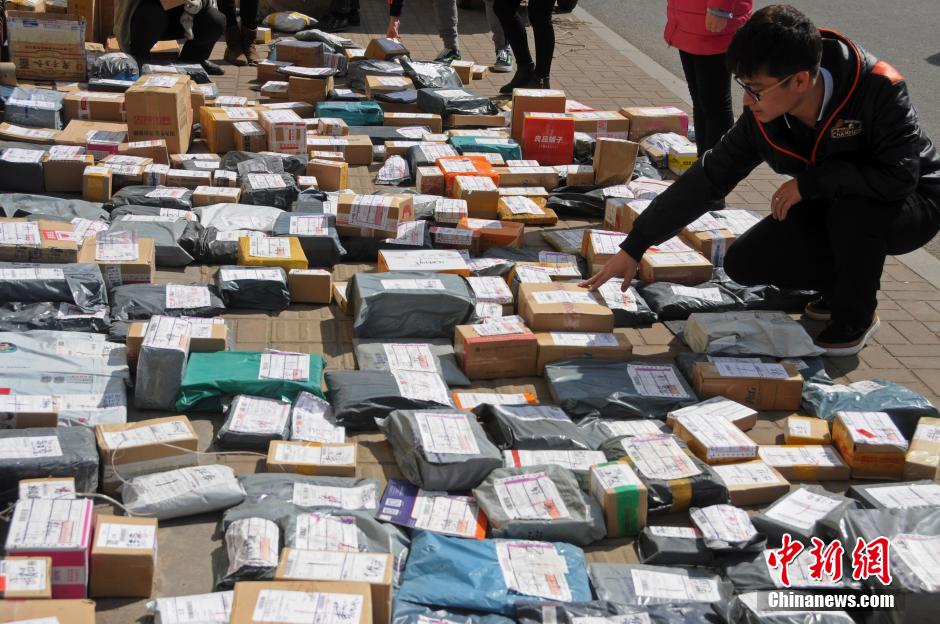 A student looks for his package outside a university campus in Taiyuan, north China's Shanxi province on March 10, 2015. (Photo/Chinanews.com)