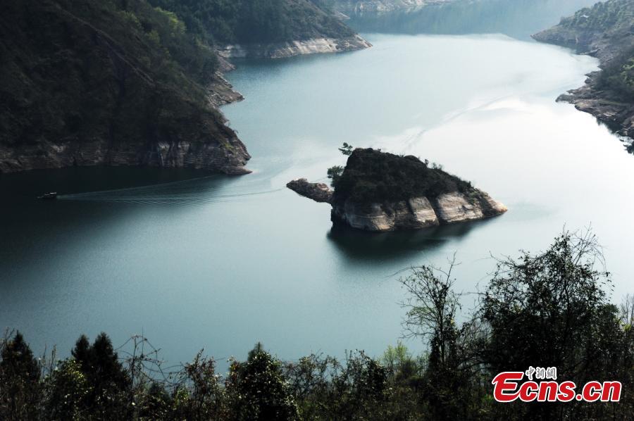 A tortoise shaped island emerges as water levels of the Three Gorges Reservoir fall in Yunyang county, Southwest China’s Chongqing municipality, March 12, 2015. The Three Gorges Dam, the world's largest water control and hydropower project on the Yangtze River, has been discharging water to downstream areas in spring. The island, actually a part of a mountain, has little left above water when the water level hits its peak height of 175 meters. (Photo: China News Service/Rao Guojun)