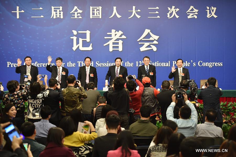 Xie Heping, Shen Jian, Luo Weiqi, Li Jianbao, Zheng Qiang, five deputies to the 12th National People's Congress (NPC), give a press conference about China's higher education during the third session of the 12th NPC in Beijing, capital of China, March 13, 2015. (Xinhua/Li Ran)