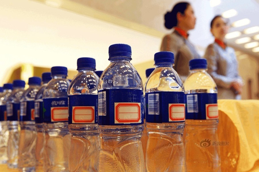Aiming to be thrifty, bottled mineral water with blank name tags are provided for the deputies attending the two sessions when they arrive at Beijing Capital International Airport, March 2, 2014. This is the first time the "two sessions" use name tags on bottled water.[Photo by Jin Liangkuan/Xinhua]