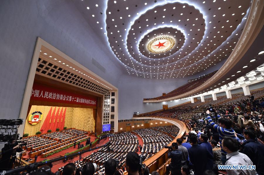 The closing meeting of the third session of the 12th National Committee of the Chinese People's Political Consultative Conference (CPPCC) is held at the Great Hall of the People in Beijing, capital of China, March 13, 2015. (Xinhua/Li Xin)