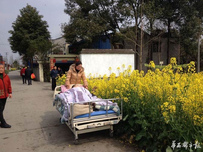 A woman takes her paralyzed husband in a movable sickbed to appreciate rape flowers in Deyang, southwest China's Sichuan province. The story was reported by the West China City Daily, a local newspaper on March 11, 2015. (Photo/WCCDaily)