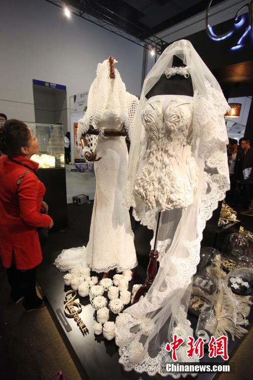 Two wedding dresses made by 3D printer at "TCT + Personalize Asia" Exhibition attracted a lot of attention in Shanghai on March 12, 2015. The two dresses are made of nylon powder by a 3D printer. They are just as wearable as real wedding dresses. But it takes about 20,000 yuan and a whole week to make a dress like this. (Chinanews/Zhang Hengwei)