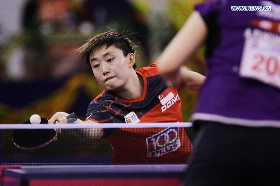 Feng Tianwei of Singapore returns a ball during women's singles semifinal match against Fukuhara Ai of Japan on the second day of the 28th Table Tennis Asian Cup in Jaipur, India, March 14, 2015. Feng Tianwei won 4-3. (Xinhua/Zheng Huansong)