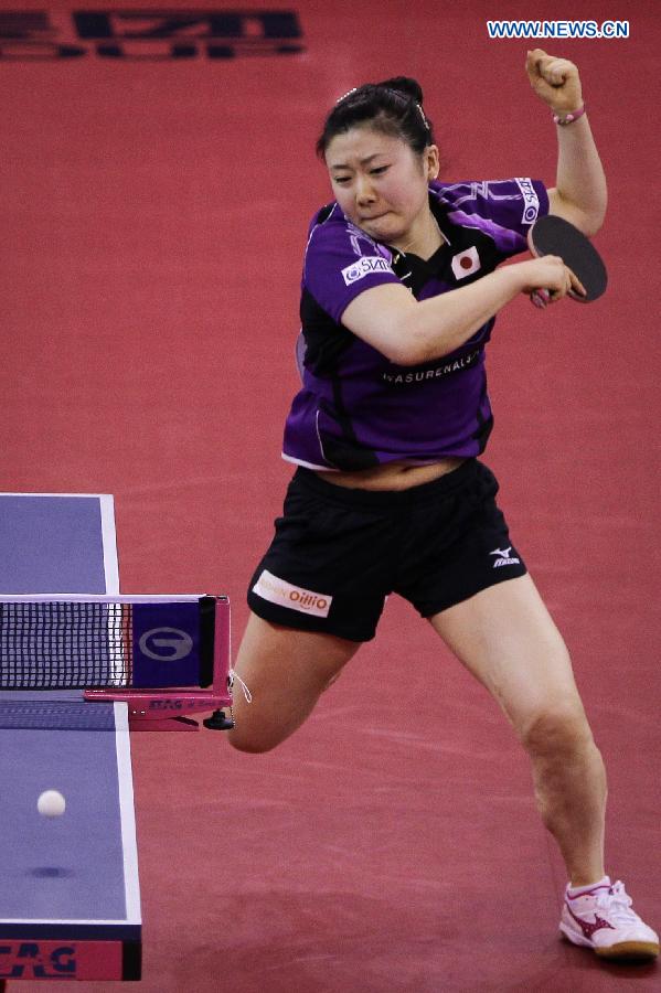 Fukuhara Ai of Japan returns a ball during women's singles semifinal match against Feng Tianwei of Singapore on the second day of the 28th Table Tennis Asian Cup in Jaipur, India, March 14, 2015. Fukuhara Ai lost 3-4. (Xinhua/Zheng Huansong)