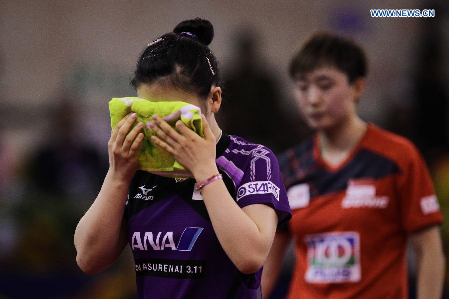 Fukuhara Ai of Japan returns a ball during women's singles semifinal match against Feng Tianwei of Singapore on the second day of the 28th Table Tennis Asian Cup in Jaipur, India, March 14, 2015. Fukuhara Ai lost 3-4. (Xinhua/Zheng Huansong)