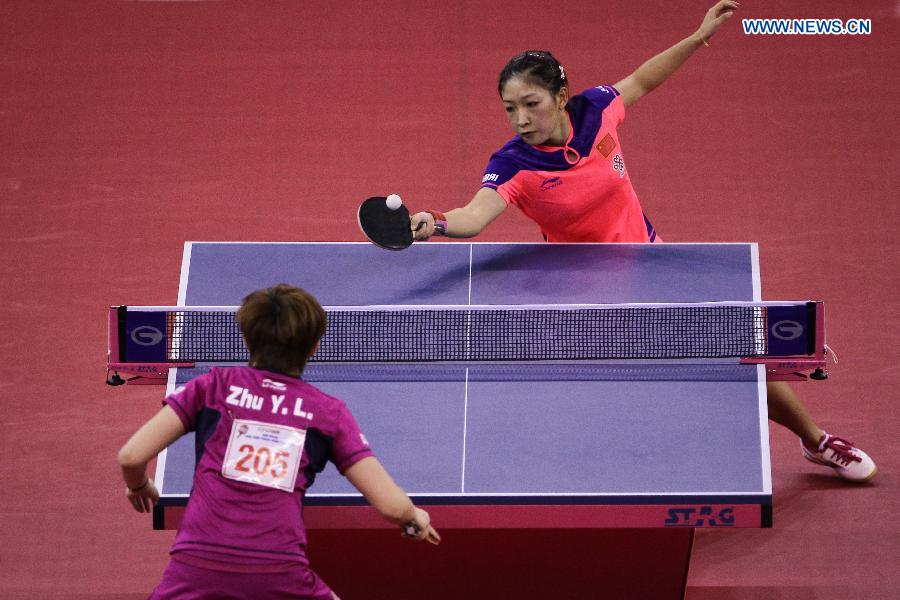 Liu Shiwen of China returns a ball during women's singles semifinal match against Zhu Yuling of China on the second day of the 28th Table Tennis Asian Cup in Jaipur, India, March 14, 2015. Liu Shiwen won 4-2. (Xinhua/Zheng Huansong)