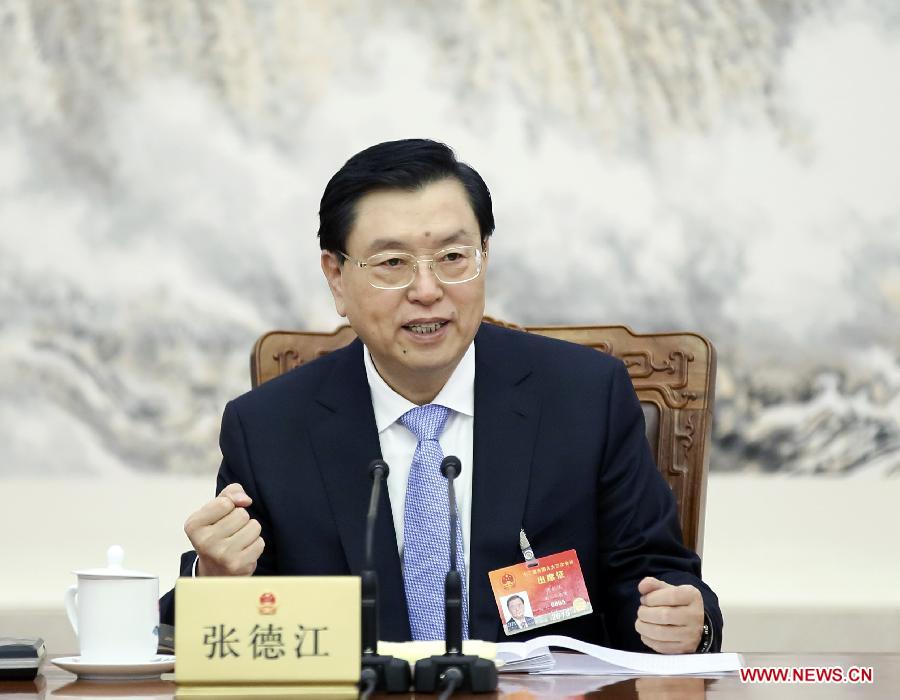 Zhang Dejiang, executive chairperson of the presidium of the third session of China's 12th National People's Congress (NPC) and chairman of the NPC Standing Committee, presides over the second meeting of the presidium's executive chairpersons at the Great Hall of the People in Beijing, capital of China, March 14, 2015. (Xinhua/Lan Hongguang)