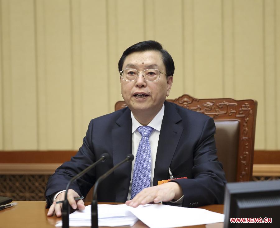 Zhang Dejiang, executive chairperson of the presidium of the third session of China's 12th National People's Congress (NPC), presides over the fourth meeting of the presidium at the Great Hall of the People in Beijing, capital of China, March 14, 2015. (Xinhua/Lan Honggguang)