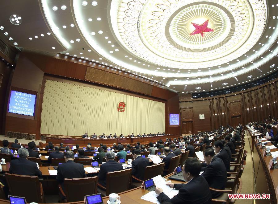 | Zhang Dejiang, executive chairperson of the presidium of the third session of China's 12th National People's Congress (NPC), presides over the fourth meeting of the presidium at the Great Hall of the People in Beijing, capital of China, March 14, 2015. (Xinhua/Lan Honggguang) |