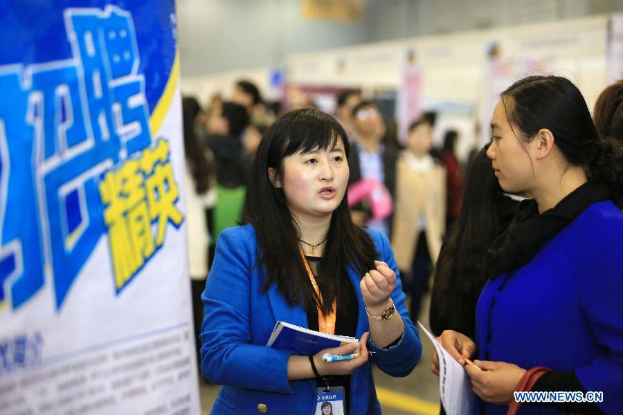 A recruiter talks with a job seeker at a job fair held for fresh graduates in Chengdu, capital of southwest China's Sichuan Province, March 14, 2015. Over 70,000 opportunities were offered at the fair. (Xinhua/Zhang Zhenxiang)