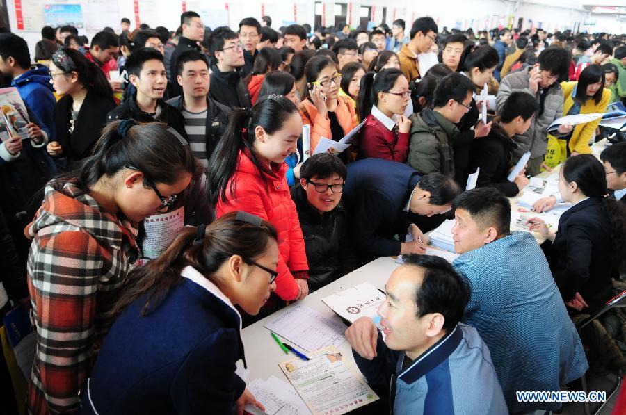 Job seekers consult recruiters about job information at a job fair held for fresh graduates in Liaocheng City, east China's Shandong Province, March 14, 2015. Over 10,000 opportunities were offered at the fair. (Xinhua/Zhang Zhenxiang)