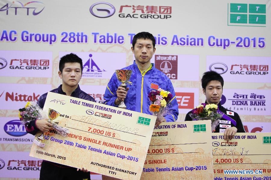 Xu Xin (C) of China, Fan Zhendong (L) of China and Mizutani Jun of Japan attend the award ceremony at the 28th Table Tennis Asian Cup in Jaipur, India, March 15, 2015. Xu Xin won 4-3 to claim the title. (Xinhua/Zheng Huansong)