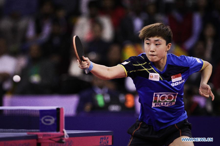 Feng Tianwei of Singapore returns a ball during her women's singles final match against Liu Shiwen of China at the 28th Table Tennis Asian Cup in Jaipur, India, March 15, 2015. Feng Tianwei won 4-3 to claim the title. (Xinhua/Zheng Huansong)