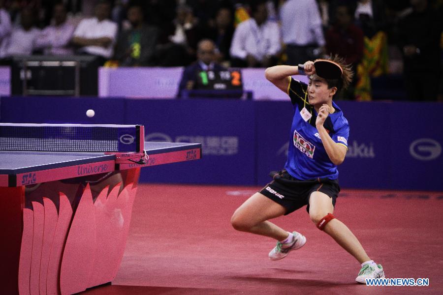 Feng Tianwei of Singapore returns a ball during her women's singles final match against Liu Shiwen of China at the 28th Table Tennis Asian Cup in Jaipur, India, March 15, 2015. Feng Tianwei won 4-3 to claim the title. (Xinhua/Zheng Huansong)