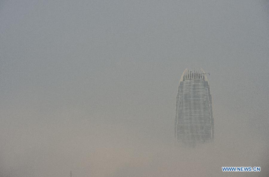 | The International Finance Center is shrouded in heavy fog in Hong Kong, south China, March 16, 2015. A heavy fog blanketed Hong Kong on Monday with visibility less than one kilometers in many waters. (Xinhua/Liu Siu Wai) |