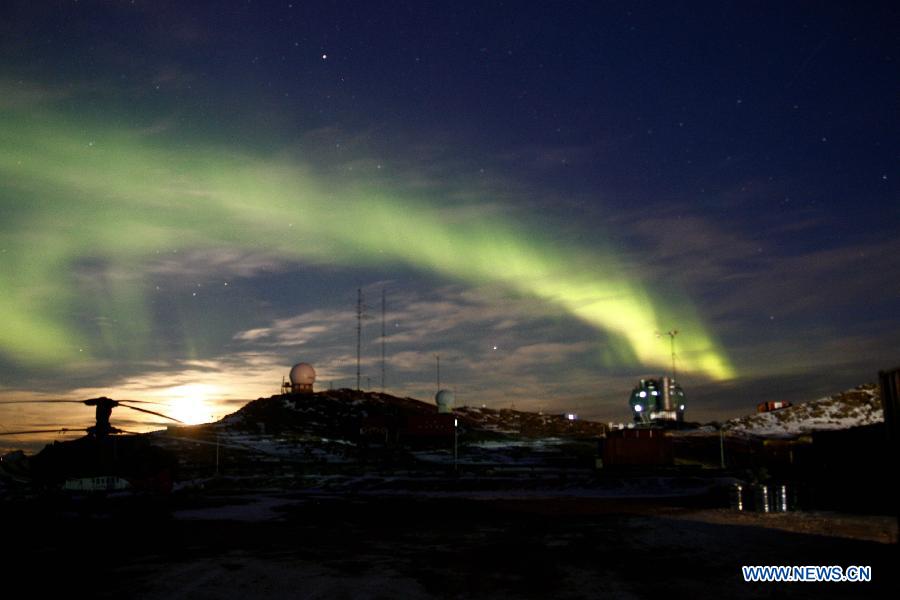 | Photo taken on March 3, 2015 shows the scenery of aurora at the Zhongshan Station, a Chinese scientific research base in Antarctica. (Xinhua/Wang Gangyi) |