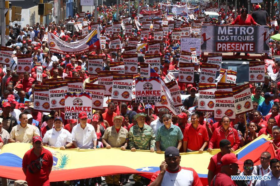 Railway workers take part in a march against the recent actions by the U.S. Government against Venezuela, in Caracas, Venezuela, on March 16, 2015. (Xinhua/Gregorio Teran/AVN)