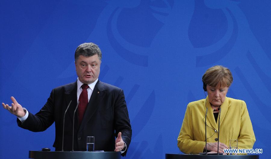 German Chancellor Angela Merkel (R) attends a press conference with Ukrainian President Petro Poroshenko in Berlin, Germany, March 16, 2015. Merkel on Monday promised Ukraine further assistance to achieve a peaceful solution in eastern regions of the country during a meeting with Ukrainian President Petro Poroshenko. (Xinhua/Shang Jing)