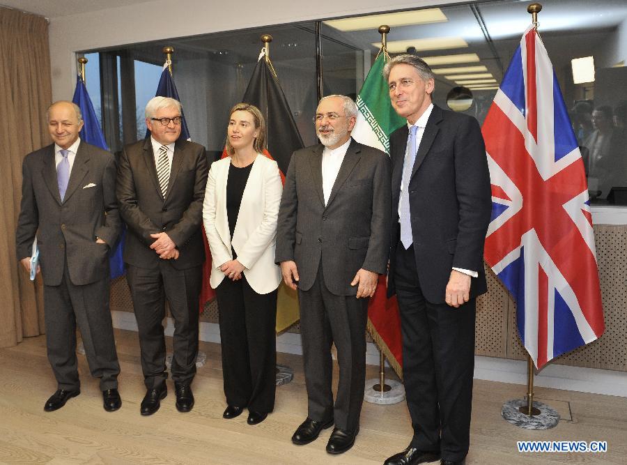 France's Foreign Minister Laurent Fabius, Germany's Foreign Minister Frank Walter Steinmeier, EU High Representative for Foreign Affairs and Security Policy Federica Mogherini, Iran's Foreign Minister Mohammad Javad Zarif and British Foreign Secretary Philip Hammond (from L to R) pose for photos during a meeting of Iran nuclear negotiations in Brussels, Beglium, March 16, 2015. (Xinhua/Ye Pingfan)