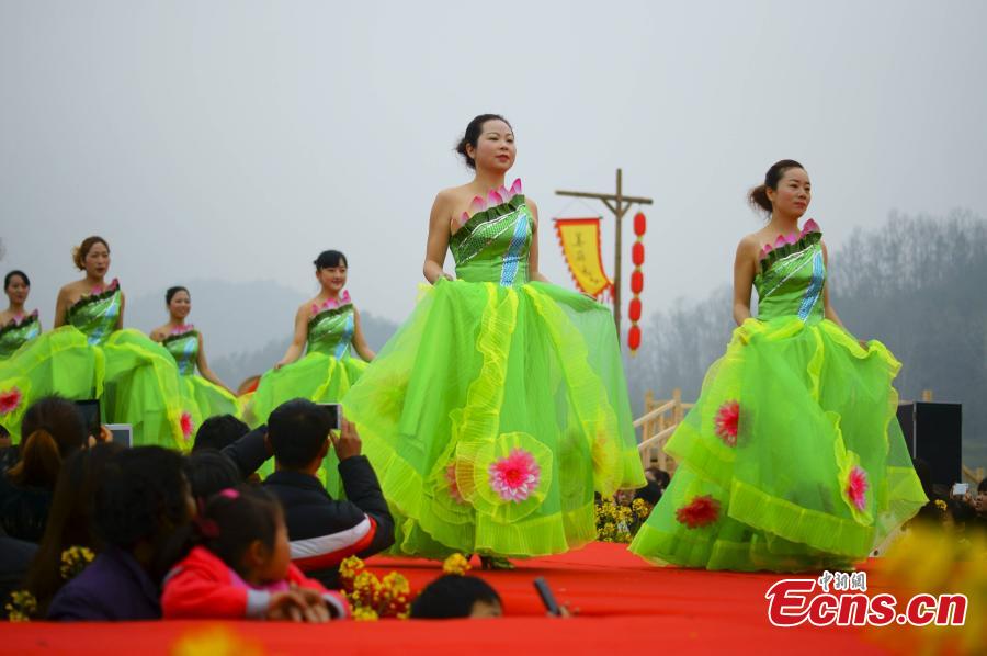 Models walk the runway in a countryside fashion show during the second Rapeseed Festival in Yuan’an county, Yichang city, Central China’s Hubei province, March 14, 2015. The blooming flowers make Yuan’an county a destination for tourists to go for a spring outing. (Photo: China News Service/Zhou Jianping)