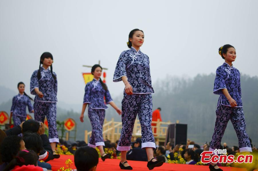 Models walk the runway in a countryside fashion show during the second Rapeseed Festival in Yuan’an county, Yichang city, Central China’s Hubei province, March 14, 2015. The blooming flowers make Yuan’an county a destination for tourists to go for a spring outing. (Photo: China News Service/Zhou Jianping)