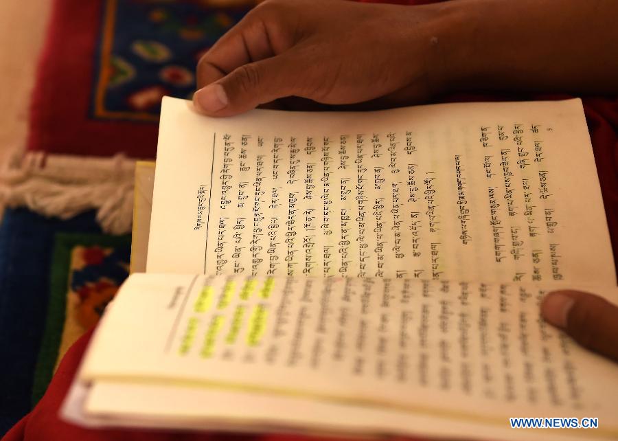 A monk reads a book of Buddhist Theory during a class at the Yunnan Institute of Buddhist Studies Diqing Branch in Shangri-la County, southwest China's Yunnan Province, March 16, 2015. Located at an altitude of 3,300 meters, Yunnan Institute of Buddhist Studies Diqing Branch is an important school of Tibetan Buddhism in Yunnan. Established in 2005, the institute now has a total of 68 monks, who are from some monasteries in Yunnan, Sichuan and Tibet. Besides daily chanting sutras, monks here also take classes such as Tibetan language, Chinese, Buddhist Theory, Politics, English and Computer. (Xinhua/Lin Yiguang)