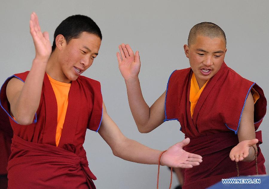 File photo taken on March 15, 2010 shows monks debating on Tibetan Buddhism doctrines at the Yunnan Institute of Buddhist Studies Diqing Branch in Shangri-la County, southwest China's Yunnan Province. Located at an altitude of 3,300 meters, Yunnan Institute of Buddhist Studies Diqing Branch is an important school of Tibetan Buddhism in Yunnan. Established in 2005, the institute now has a total of 68 monks, who are from some monasteries in Yunnan, Sichuan and Tibet. Besides daily chanting sutras, monks here also take classes such as Tibetan language, Chinese, Buddhist Theory, Politics, English and Computer. (Xinhua/Lin Yiguang)