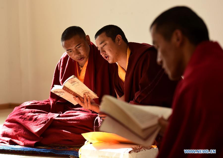 Monks attend a class of Buddhist Theory at the Yunnan Institute of Buddhist Studies Diqing Branch in Shangri-la County, southwest China's Yunnan Province, March 16, 2015. Located at an altitude of 3,300 meters, Yunnan Institute of Buddhist Studies Diqing Branch is an important school of Tibetan Buddhism in Yunnan. Established in 2005, the institute now has a total of 68 monks, who are from some monasteries in Yunnan, Sichuan and Tibet. Besides daily chanting sutras, monks here also take classes such as Tibetan language, Chinese, Buddhist Theory, Politics, English and Computer. (Xinhua/Lin Yiguang)