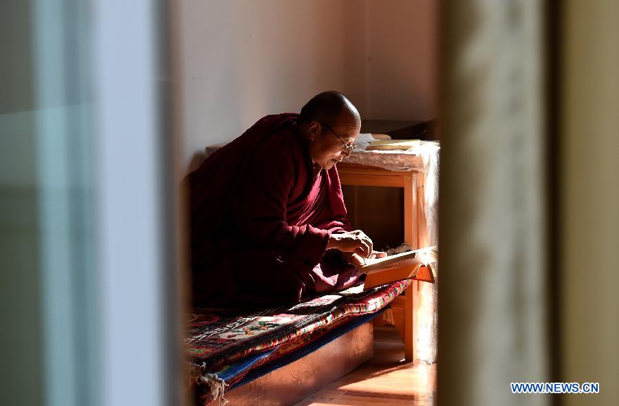 A Buddhist teacher is seen during a class of Buddhist Theory at the Yunnan Institute of Buddhist Studies Diqing Branch in Shangri-la County, southwest China's Yunnan Province, March 16, 2015. Located at an altitude of 3,300 meters, Yunnan Institute of Buddhist Studies Diqing Branch is an important school of Tibetan Buddhism in Yunnan. Established in 2005, the institute now has a total of 68 monks, who are from some monasteries of Yunnan, Sichuan and Tibet. Besides daily sutras, monks here also take classes such as Tibetan language, Chinese, Buddhist Theory, Politics, English and Computer. (Xinhua/Lin Yiguang)