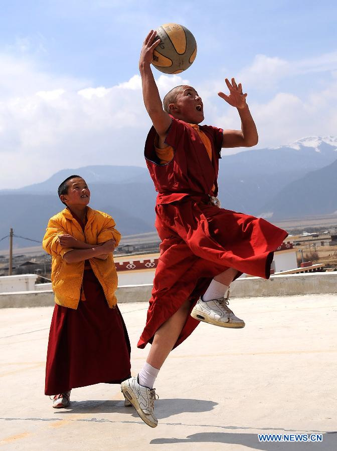 File photo taken on March 15, 2010 shows monks playing basketball at the Yunnan Institute of Buddhist Studies Diqing Branch in Shangri-la County, southwest China's Yunnan Province. Located at an altitude of 3,300 meters, Yunnan Institute of Buddhist Studies Diqing Branch is an important school of Tibetan Buddhism in Yunnan. Established in 2005, the institute now has a total of 68 monks, who are from some monasteries in Yunnan, Sichuan and Tibet. Besides daily chanting sutras, monks here also take classes such as Tibetan language, Chinese, Buddhist Theory, Politics, English and Computer. (Xinhua/Lin Yiguang)