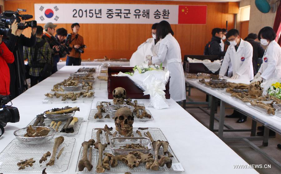 South Korean workers prepare the remains of Chinese soldiers who died in the Korean War, in Paju, South Korea, March 16, 2015. The remains of 68 Chinese soldiers will be flown back to China after a handover ceremony at Incheon Airport on March 20.(Xinhua/Yao Qilin)