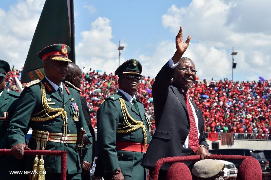 | Lesotho's newly-elected Prime Minister Pakalitha Mosisili (front) waves to the spectators during the inauguration ceremony in Maseru, capital of Lesotho, on March 17, 2015. Lesotho's newly-elected Prime Minister Pakalitha Mosisili was inaugurated on Tuesday with a call for unity in the kingdom. (Xinhua/DOC/Elmond Jiyane) |