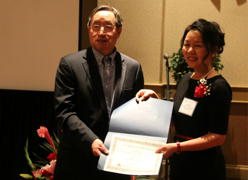 Si Ma, vice president of the Chinese Enterprise Association in Northern California presents congratulatory letter to Xia Wu, president of People's Daily Online West USA. (People's Daily Online/ Joann Chen)