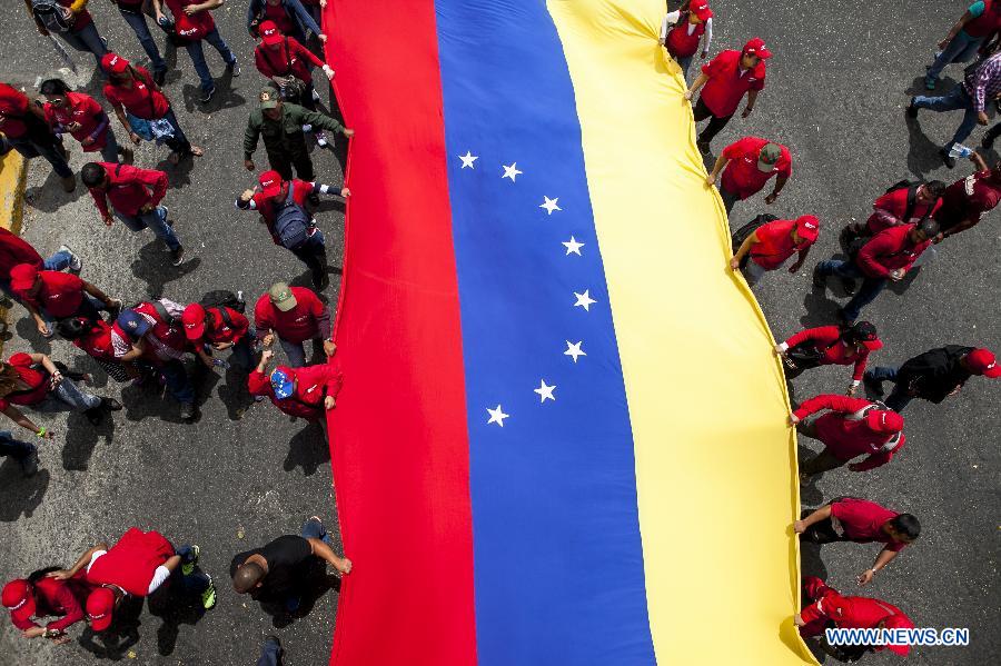 Oil workers hold a national flag during a rally in Caracas, Venezuela, March 18, 2015. Venezuelan President Nicolas Maduro said on Wednesday that his government would start a world campaign this week to demand U.S. President Barack Obama repeal his executive order declaring Venezuela as a "threat" to the U.S. national security. (Xinhua/Str)