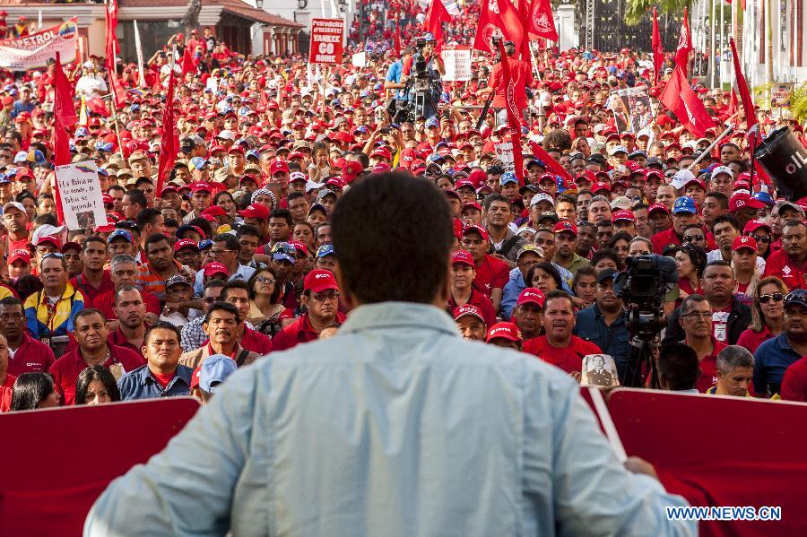 | Venezuela's President Nicolas Maduro delivers a speech to oil and electrical workers in Caracas March 18, 2015. Nicolas Maduro said on Wednesday that his government would start a world campaign this week to demand U.S. President Barack Obama repeal his executive order declaring Venezuela as a "threat" to the U.S. national security. (Xinhua/Str) |