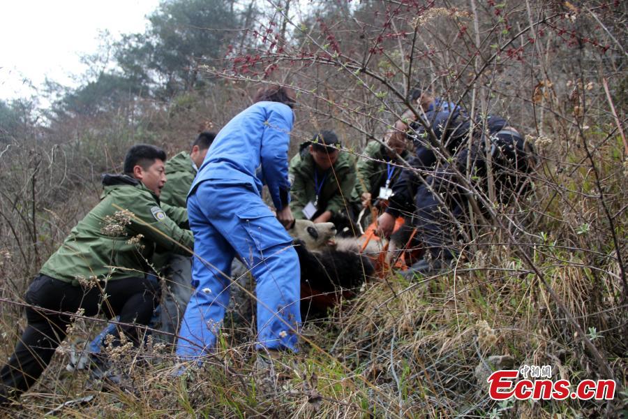 Experts rescue a sick wild female panda, found in Gengda Town, Southwest China's Sichuan province, March 18, 2015. The panda is 10 years old and weighs about 65kg, according to the Wolong National Nature Reserve. Experts at the China Conservation and Research Center for Giant Pandas anaesthetized the panda and sent it to a veterinary hospital for examination. The panda was quarantined and will be sent back to Wolong National Nature Reserve after recovery. (Photo: China News Service/Zhong Xin)
