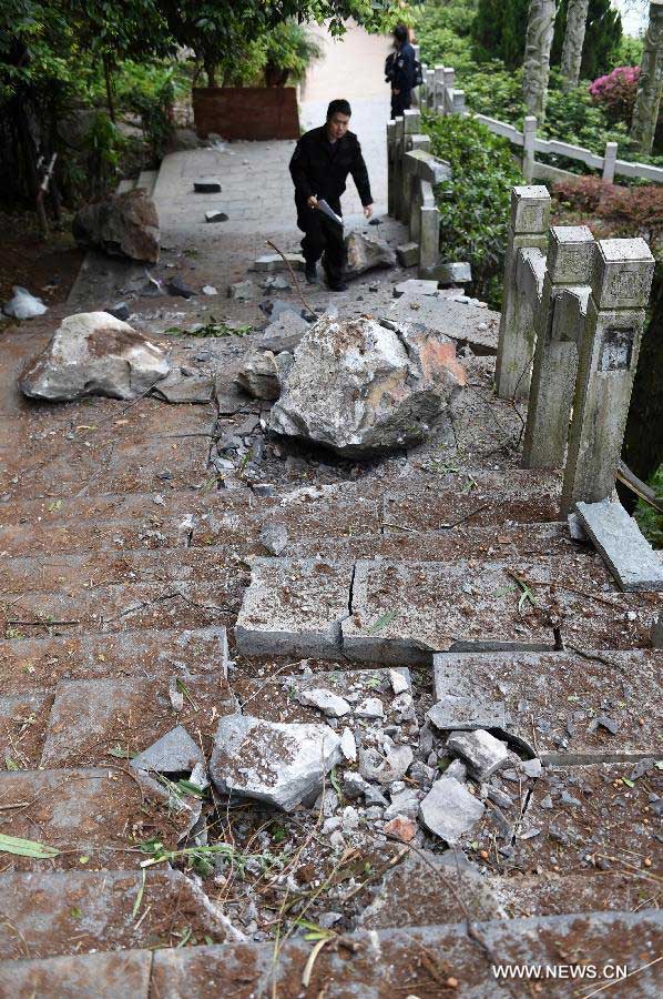 | Policemen check the incident site at a scenic spot in Guilin, southwest China's Guangxi Zhuang Autonomous Region, March 19, 2015. Seven people were killed and 19 others, including eight Taiwanese, were injured after a huge boulder fell off a mountain in Guilin Thursday morning. (Xinhua/Zhao Jiazhi) |
