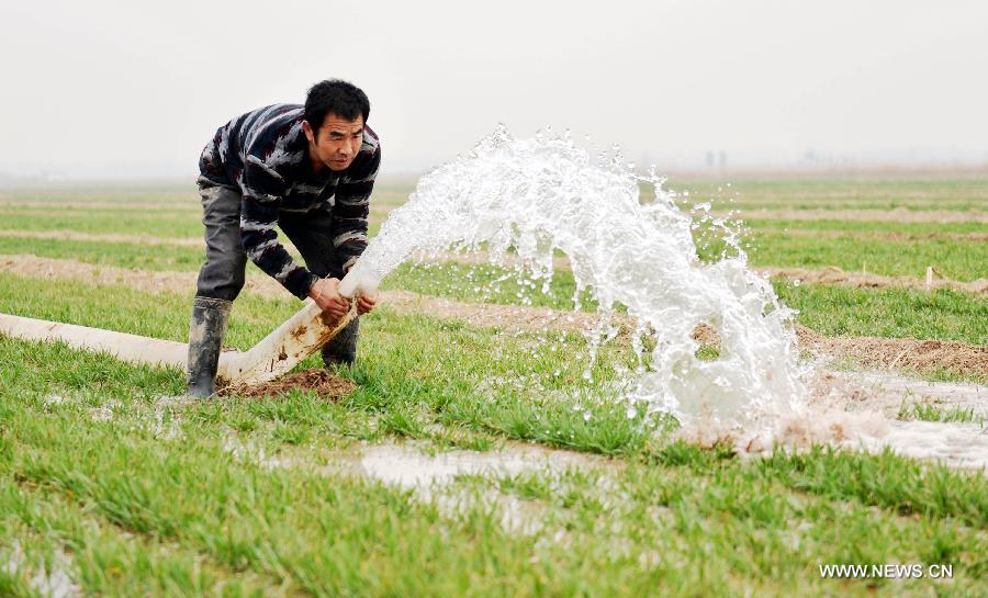 | A farmer waters the field in Yaochang Village of Botou City, north China's Hebei Province, March 19, 2015. As the farming season comes, farmers are busy with spring ploughing. (Xinhua/Zhu Xudong) |