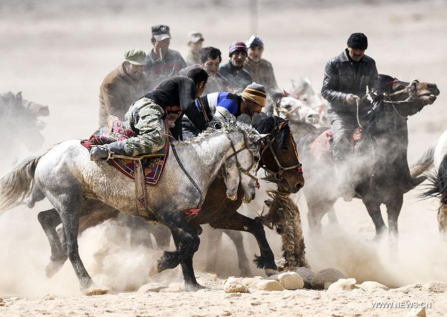 Horsemen of the Tajik ethnic group attend Buzkashi competition in Tizinafu Township of Taxkorgan Tajik Autonomous County, northwest China's Xinjiang Uygur Autonomous Region, March 18, 2015. Buzkashi is a sport for horsemen to compete to drag a goat carcass. (Xinhua/Jiang Wenyao)