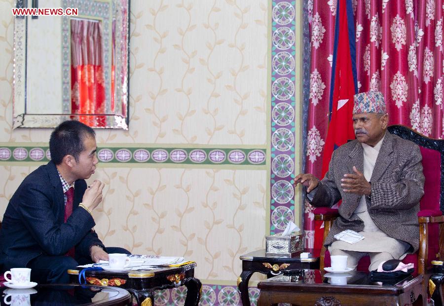| Nepali President Ram Baran Yadav (R) receives an interview with Xinhua in Kathmandu, Nepal, March 18, 2015. Nepali President Ram Baran Yadav has expressed hope that his meeting with Chinese President Xi Jinping during the forthcoming Boao Forum for Asia Annual Conference 2015 would be productive in strengthening bilateral ties. (Xinhua/Pratap Thapa) |