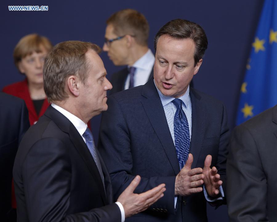 British Prime Minister David Cameron (R) talks with European Council President Donald Tusk (L) while attending the family photo session of European Union (EU) summit in Brussels, Belgium, on March 19, 2015. European heads of state gathered here to hold the regular spring summit debate Thursday, with development of the Energy Union, situation in Ukraine, relations with Russia, and the EU's economic situation top on the agenda.(Xinhua/Zhou Lei)