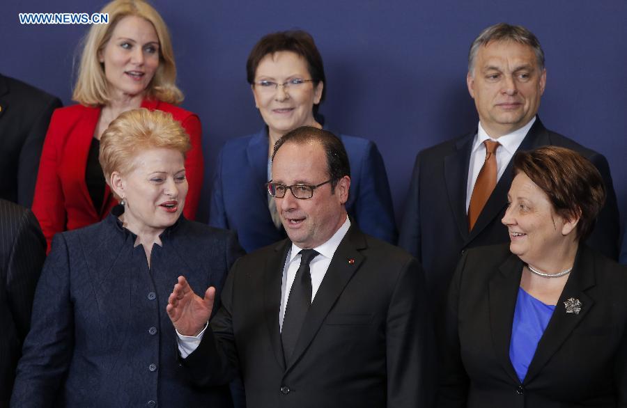 French President Francois Hollande (C, front) talks with Lithuanian President Dalia Grybauskaite (L, front) while attending the family photo session of European Union (EU) summit in Brussels, Belgium, on March 19, 2015. European heads of state gathered here to hold the regular spring summit debate Thursday, with development of the Energy Union, situation in Ukraine, relations with Russia, and the EU's economic situation top on the agenda.(Xinhua/Zhou Lei)