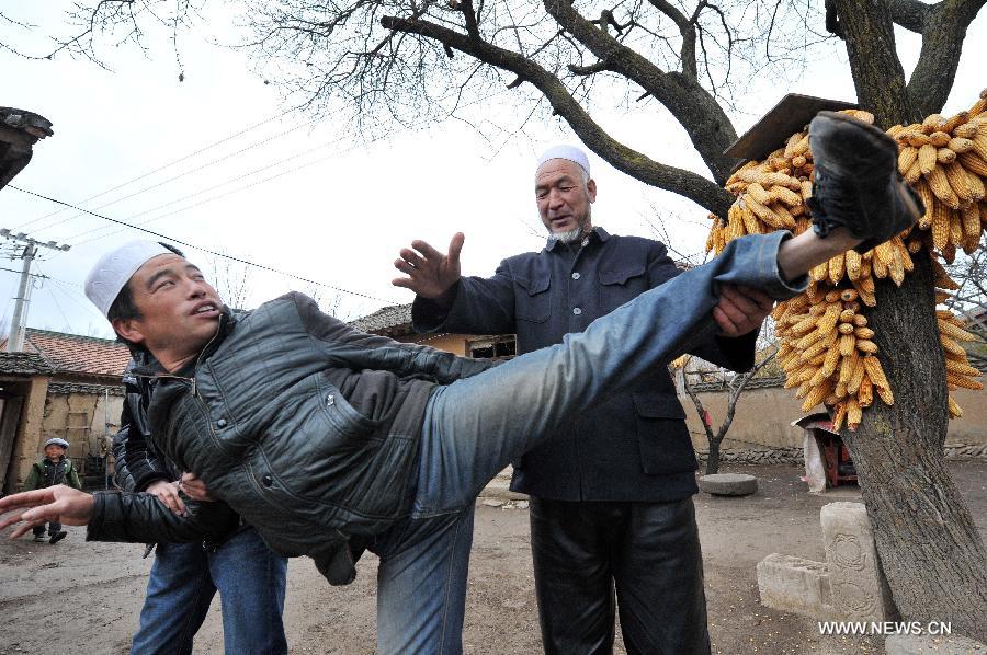 Ma Rongtang (R) instructs his apprentices to practise Tajiao skill, a traditional martial art of the Hui ethnic group, in Xiangshui Township of Jingyuan County, northwest China's Ningxia Hui Autonomous Region, March 19, 2015. Originated in the Tang Dynasty (618-907), Tajiao is a self-defense skill that has been listed as one of the autonomous region's intangible cultural heritages. 63-year-old Ma, the fourth generation successor of this traditional martial art, has trained more than 100 young people over the past few years. (Xinhua/Peng Zhaozhi)