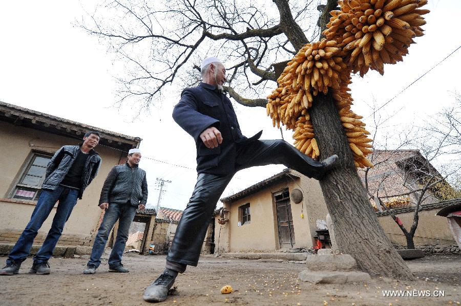 Ma Rongtang demonstrates Tajiao skill, a traditional martial art of the Hui ethnic group, to his apprentices in Xiangshui Township of Jingyuan County, northwest China's Ningxia Hui Autonomous Region, March 19, 2015. Originated in the Tang Dynasty (618-907), Tajiao is a self-defense skill that has been listed as one of the autonomous region's intangible cultural heritages. 63-year-old Ma, the fourth generation successor of this traditional martial art, has trained more than 100 young people over the past few years. (Xinhua/Peng Zhaozhi)