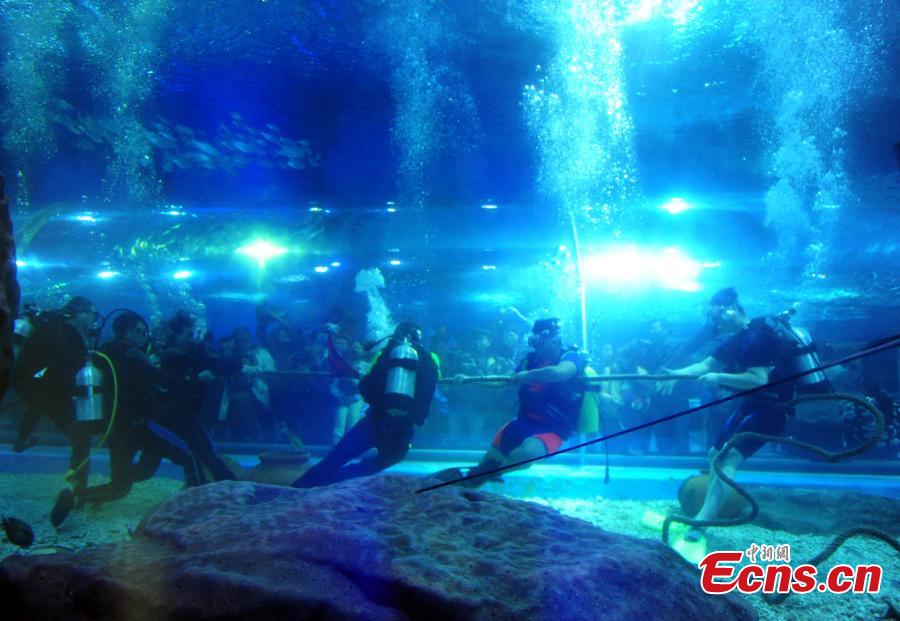 Three taxi drivers in diving suits join an underwater tug of war competition held in an aquarium in Wuhan, Hubei province on March 19, 2015. The aquarium invited over 1,000 taxi drivers to visit the marine museum for free on the day. (Photo: China News Service/ Zhang Chang)