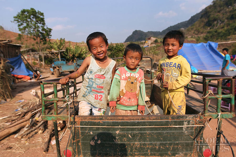 Three children who fled from Kokang, Myanmar with their family play on a tractor in Lincang, Yunnan Province on March 18. Many Myanmar refugees have sought asylum in China after violence broke out in the Kokang capital of Laukkai. (Photo: Cui Meng/GT)
