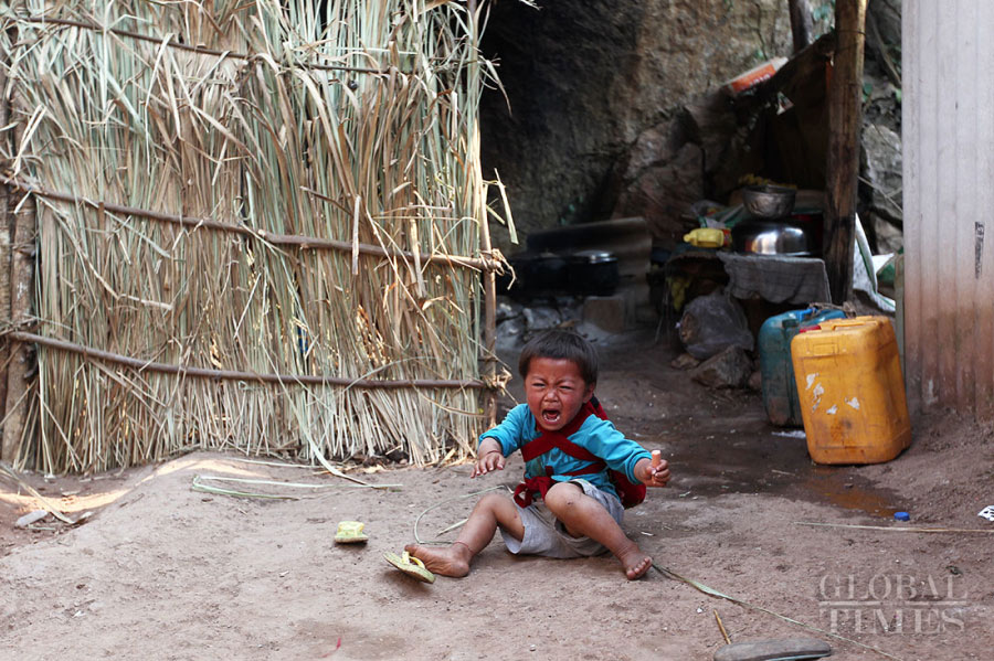 A two-year-old named Wang Xin cries outside a cooking area at the refugee shelter in Lincang, Yunnan Province on March 18. (Photo: Cui Meng/GT)