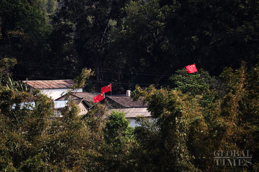 Chinese flags wave outside homes in Nansan county in Lincang, Yunnan Province. Many residents of the county, which borders the conflict-torn region of northern Myanmar, have hung Chinese flags outside their homes to prevent Myanmar warplanes from dropping bombs. (Photo: Cui Meng/GT)