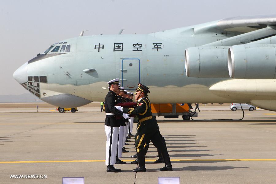 | Soldiers of the Chinese People's Liberation Army (R) receive coffins containing remains of soldiers of the Chinese People's Volunteers (CPV) dead in the 1950-53 Korean War, during a handover ceremony at the Inchon International Airport of South Korea, March 20, 2015. (Xinhua/Yao Qilin) |